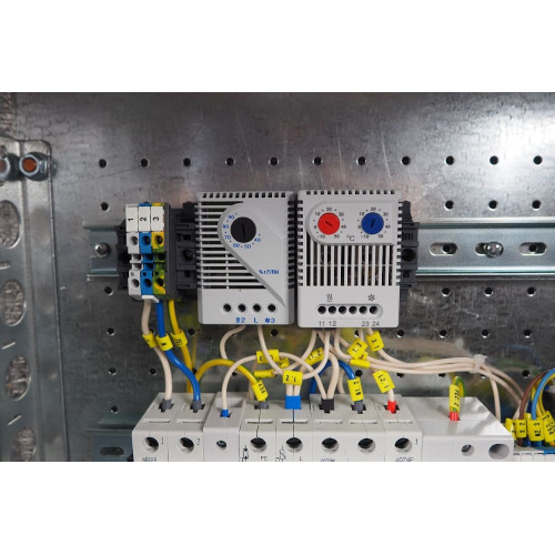 В комплектацию включены: разрядник перенапряжения, индикатор напряжения, защитный дифференциальный выключатель, автоматический выключатель, розетка на DIN-рейку, проводной контур заземления, шина заземления. Аппаратура установлена на входящую в комплект DIN-рейку, расположенную в задней части шкафа. Вентиляционные отверстия в двери вырезаны наискось и прикрыты козырьками — для свободной циркуляции воздуха без риска попадания во внутреннее пространство воды и посторонних предметов.