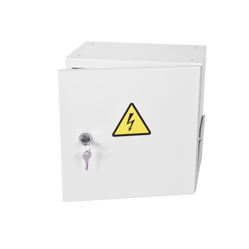 Шкаф поставляется собранным, с задней оцинкованной перфорированной панелью и двумя юнитовыми монтажными профилями Листовые детали покрыты предварительно фосфатированной полимерной порошковой краской. Цвет — светло-серый (RAL 7035). Размер — 500×300×500 мм, вес — 19 кг.