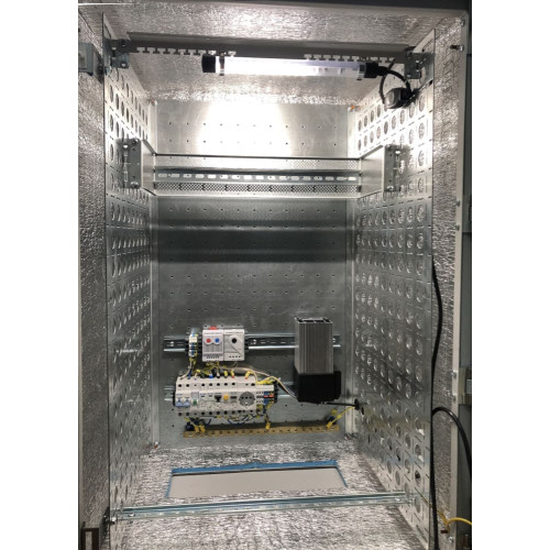 Листовые детали окрашены светло-серой (RAL 7035) порошковой краской — для дополнительной защиты. Шкаф разработан для навесного монтажа на стену или столб, но его можно ставить на ровную горизонтальную поверхность. Крепежные элементы не входят в комплект (за исключением уголков для настенной установки). Габариты шкафа — 620×330×800 мм, вес — 57 кг.