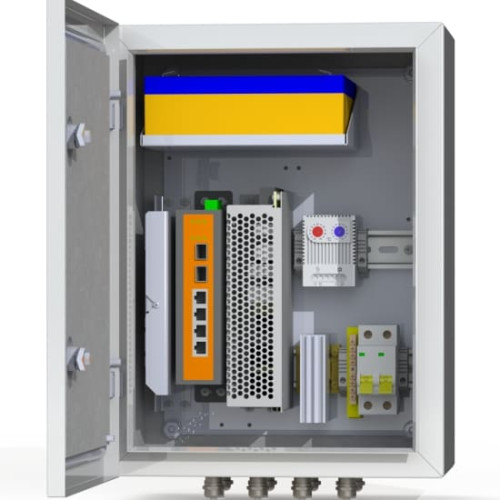 Телекоммуникационный шкаф Mastermann 6 УТП 4К ГЗ АКБ 2А для эксплуатации в любых климатических условиях при температуре –60 °С… +50 °С состоит из цельнометаллического корпуса, герметичной (уплотнитель по периметру) двери, монтажной панели. Укомплектован обогревателем мощностью 50 Вт, 6-амперным 2-полюсным защитным автоматом, сдвоенным термостатом, блоком бесперебойного питания мощностью 155 Вт, промышленным неуправляемым 4-портовым PoE-коммутатором с двумя SFP-слотами, оптическим кроссом с 4 SC-портами, четырьмя гермовводами PG9 и четырьмя PG13.5, двумя DIN-рейками, шиной заземления.