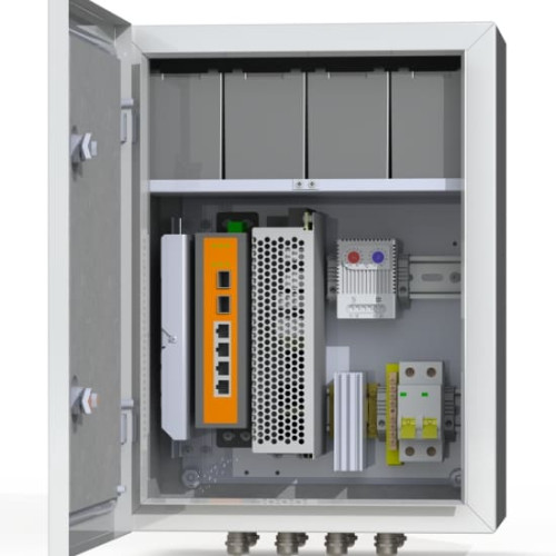 Телекоммуникационный шкаф Mastermann 6 УТП 4КУ АКБ 7А рассчитан на уличную эксплуатацию в любое время года: защита корпуса от пыли и влаги соответствует стандарту IP66, внутренние поверхности утеплены фольгированным изолоном, по периметру двери проложен уплотнитель, рабочие температуры — –60 °С… +50 °С. Укомплектован обогревателем мощностью 50 Вт, 6-амперным 2-полюсным защитным автоматом, сдвоенным термостатом, блоком бесперебойного питания мощностью 155 Вт, промышленным управляемым 4-портовым PoE-коммутатором с двумя SFP-слотами и консольным портом, оптическим кроссом с 4 SC-портами, четырьмя гермовводами PG9 и четырьмя PG13.5, двумя DIN-рейками, шиной заземления, оцинкованной перфорированной монтажной панелью.