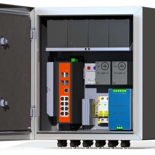 Телекоммуникационный шкаф Mastermann 8 УТП 8К ГЗ АКБ 7А для эксплуатации в любых климатических условиях при температуре –60 °С… +50 °С состоит из цельнометаллического корпуса, герметичной (уплотнитель по периметру) двери, монтажной панели. Укомплектован обогревателем мощностью 50 Вт, 6-амперным 2-полюсным защитным автоматом, сдвоенным термостатом, блоком бесперебойного питания мощностью 300 Вт, неуправляемым 8-портовым PoE-коммутатором, оптическим кроссом с 4 SC-портами, восемью гермовводами PG9 и четырьмя PG13.5, двумя DIN-рейками, шиной заземления.