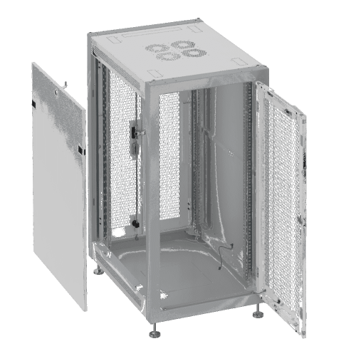 Телекоммуникационный шкаф Sysmatrix SL 6833.734 для эксплуатации в помещении с контролируемыми климатическими условиями при температурах +5 °C… +40 °C, влажности 80 % (относительно 25 °C), давлении 84 ~ 107 кПа (630 ~ 800 мм рт. ст.) отвечает требованиям ГОСТ 32127-2013, ГОСТ 28601.1, ДРГМ.301446.001ТУ. Представляет собой сборно-разборную конструкцию, состоящую из четырех стоек, основания с четырьмя вентиляционными решетками и четырьмя заглушенными отверстиями под кабельные вводы, крыши с четырьмя вентиляционными решетками и четырьмя заглушенными отверстиями под кабельные вводы, двух боковых стенок, двух перфорированных (задняя — двухстворчатая) дверей универсальной навески, двух юнитовых направляющих, контура заземления, швеллеров для дополнительной жесткости.