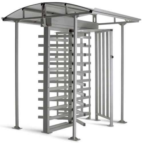Турникет адаптирован к наружным условиям эксплуатации: защита от пыли и влаги соответствует стандарту IP54, диапазон рабочих температур — -40 ºС… +55 ºС. Корпус выполнен из алюминиевого сплава с полимерно-порошковым окрашиванием «муар» с эффектом слюды. Для уличного монтажа на слабом грунте нужна монтажная рама PERCo RF01 (приобретается отдельно). Дополнительная защита от осадков — установка крыши PERCo RTC-15R (приобретается отдельно).
