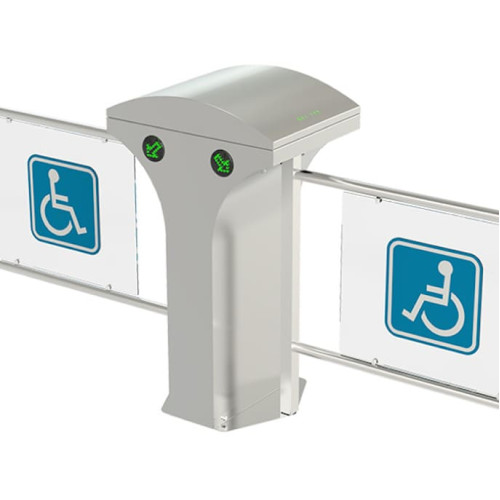 Нормально открытый сдвоенный турникет-калитка Came Saloon 605 (001PSSL605D) для маломобильных укомплектован сервопозиционным электроприводом с мотором 24 В DC, платой управления, двумя створками из нержавеющей трубы со вставкой.