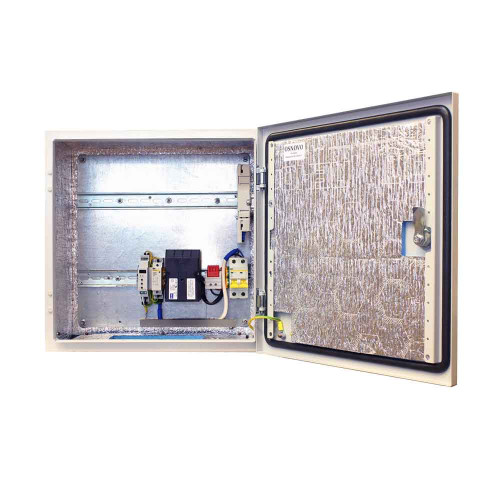 Всепогодность шкафу обеспечивают корпус с защитой от пыли и влаги по стандарту IP66, рабочие температуры — –50 ºС... +50 ºС, гермовводы. За счет нагрева и теплоизоляции температура внутри шкафа составляет 0 ºС... +50 ºС. Питание — AC 100 ~ 240 В. Энергопотребление — 200 Вт. Ширина встроенных din-реек, доступная для монтажа оборудования: верхней — 300 мм, нижней — 140 мм. Размер — 400×400×210 мм.