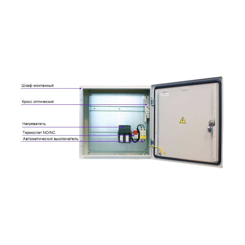 Защита корпуса от влаги и пыли — IP66, предусмотрен комплект гермовводов, рабочие температуры — –50 ºС... +50 ºС. Поддерживает температуру внутри шкафа в диапазоне –15 ºС... +50 ºС. Питание — AC 100 ~ 240 В. Потребляемая мощность — 200 Вт (с учетом обогрева). Свободный участок на din-рейках для монтажа оборудования: верхний — 320 мм, нижний — 180 мм. Размер — 400×400×210 мм.