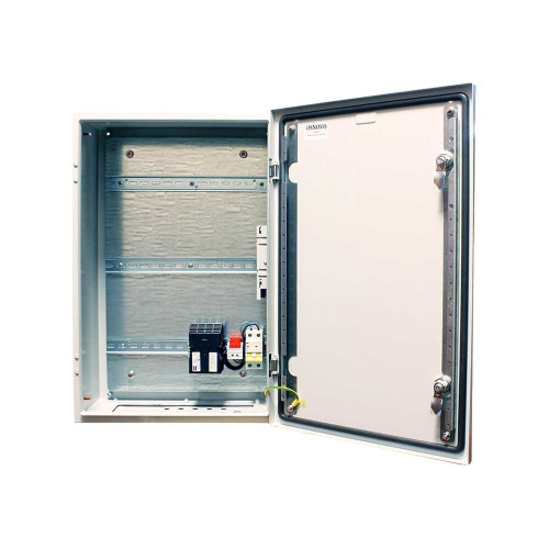 Станция Osnovo OS-46T1 предназначена для установки оборудования на улице: защита корпуса от влаги и пыли — IP66, рабочие температуры — –50 ºС... +50 ºС, предусмотрен комплект гермовводов. Состоит из герметичного стального шкафа с порошковым покрытием и устройства: