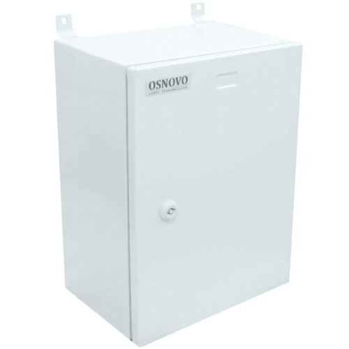 Станция Osnovo OS-341 предназначена для защиты оборудования, монтируемого на улице, и включает всепогодный герметичный шкаф и оптический кросс — разъемное соединение оптоволоконного кабеля с встраиваемым устройством. Шкаф адаптирован к круглогодичной работе на улице: защита корпуса от пыли и влаги соответствует стандарту IP66, рабочие температуры в диапазоне -50 ºС... +50 ºС, гермовводы. Для экстренного отключения станции от электросети 220 В при коротком замыкании или перегрузке предусмотрен автоматический 2-фазный выключатель на 10 A.
