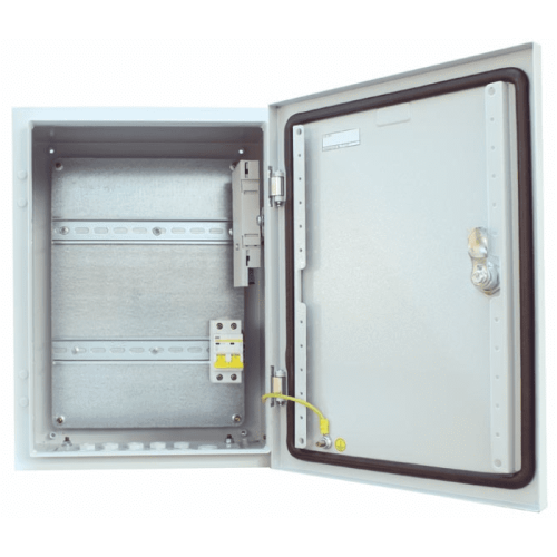 Доступная для монтажа оборудования ширина встроенных din-реек: на верхней — 210 мм, на нижней — 150 мм. Материал корпуса шкафа — металл, габариты — 300×400×210 мм.