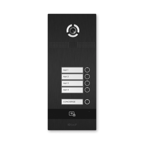 Вызывная панель BAS-IP BI-04FB black оснащена IP-камерой (2 Мп, 1/4", 0.01 лк, 110º, H.264), механическими кнопками, считывателем, LED-подсветкой, динамиком, микрофоном, интерфейсами RJ-45, RS-485, Wiegand, тампером. Поддерживает распознавание лиц, идентификацию через мобильные приложения BAS-IP Intercom и BAS-IP UKey, с мобильного устройства (Bluetooth, NFC), по карте (Mifare, EM-Marin), гостевой ссылке, QR-коду, многофакторную аутентификацию. Предусмотрено подключение кнопки выхода, датчика двери, модуля управления двумя замками.